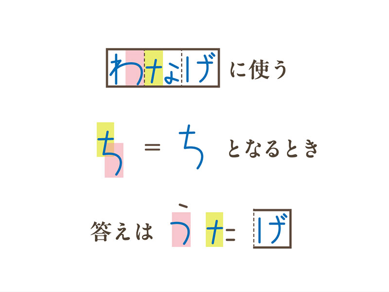 桃色の長方形には「わ」の右側、黄色の長方形は「な」の左側が当てはまります。